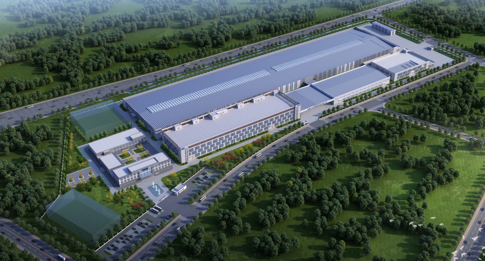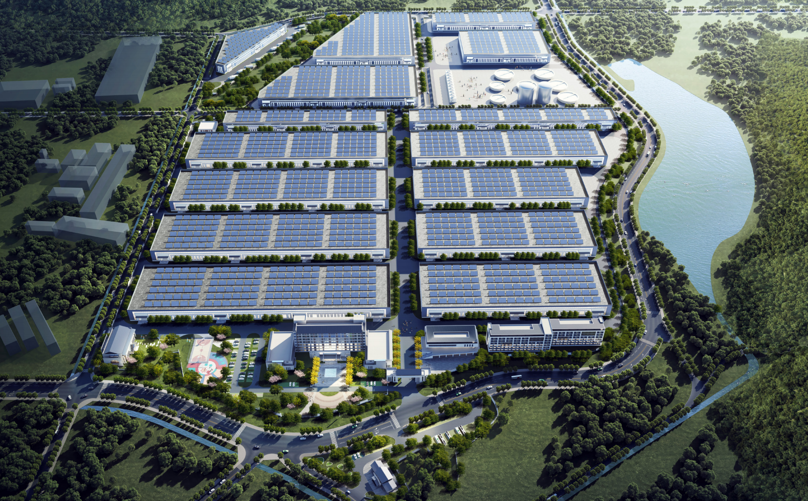 火山湖超級(jí)工廠(chǎng)項(xiàng)目包含生產(chǎn)車(chē)間、辦公樓、展廳、后勤樓、餐廳。辦公、研發(fā)、后勤生活等一系列的功能空間通過(guò)圍合式的共享庭院有機(jī)串聯(lián),結(jié)合廣場(chǎng)、庭院、景觀(guān)、休閑露臺(tái)等公共空間元素,形成立體多元、層次豐富、生動(dòng)有趣的社區(qū)型辦公生活的活力界面,打造人性化辦公模式和綠色活力空間形態(tài)。 設(shè)計(jì)力求綠色、個(gè)性,廠(chǎng)區(qū)造型采用簡(jiǎn)約明快現(xiàn)代建筑風(fēng)格,以體現(xiàn)現(xiàn)代化工業(yè)建 筑時(shí)代感,同時(shí)在體量、尺度、色彩等方面充分體現(xiàn)工業(yè)建筑的簡(jiǎn)潔氣息。建筑造型設(shè)計(jì)追求形體的簡(jiǎn)約、流暢,色彩追求鮮艷、明快。結(jié)構(gòu)經(jīng)濟(jì)合理,效果自然生動(dòng)。大膽運(yùn)用新材料,材質(zhì)采用成品夾芯板和穿孔鋁板結(jié)合,并與玻璃幕墻形成虛實(shí)對(duì)比,打造安徽火 山湖工業(yè)建筑典范。