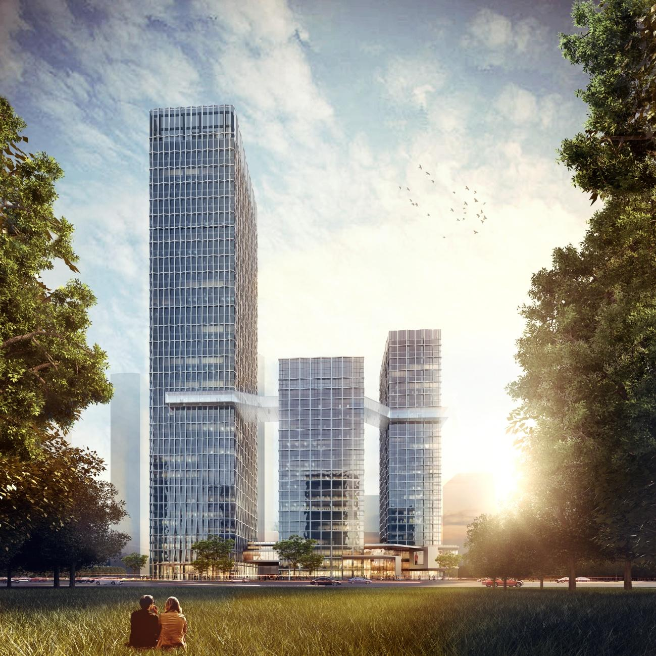 項(xiàng)目位于涇縣城區(qū)中心,未來(lái)一段時(shí)間將是涇縣唯一高端酒店,建成后將有助于提升城市對(duì)外形象,提高涇縣的招商引資能力。因此設(shè)計(jì)定位除了滿(mǎn)足酒店的基本功能需求,更要打造成區(qū)域乃至整個(gè)涇縣的地標(biāo)建筑。通過(guò)對(duì)涇縣的人文梳理,結(jié)合當(dāng)?shù)氐纳钐匦?、時(shí)代特性以及文化特性,打造出一個(gè)生態(tài)文娛新地標(biāo),區(qū)域文化的交流中心,多元化的生活中心。以城市設(shè)計(jì)為基礎(chǔ),從設(shè)計(jì)的角度出發(fā),研究酒店客房塔樓不同位置所產(chǎn)生的城市形象及擺放的不同效果,得出最優(yōu)的塔樓位置。在通過(guò)體塊的穿插、組合等手法,對(duì)各個(gè)體塊進(jìn)行推敲、變形,使得各體塊之間和而不同,又整體統(tǒng)一。而體塊的穿插過(guò)程中又產(chǎn)生各種形狀大小的架空空間、庭院空間,并與景觀(guān)處理相結(jié)合的方式加以利用,形成豐富多彩的城市開(kāi)放空間,并使得整體規(guī)劃更加協(xié)調(diào)統(tǒng)一。